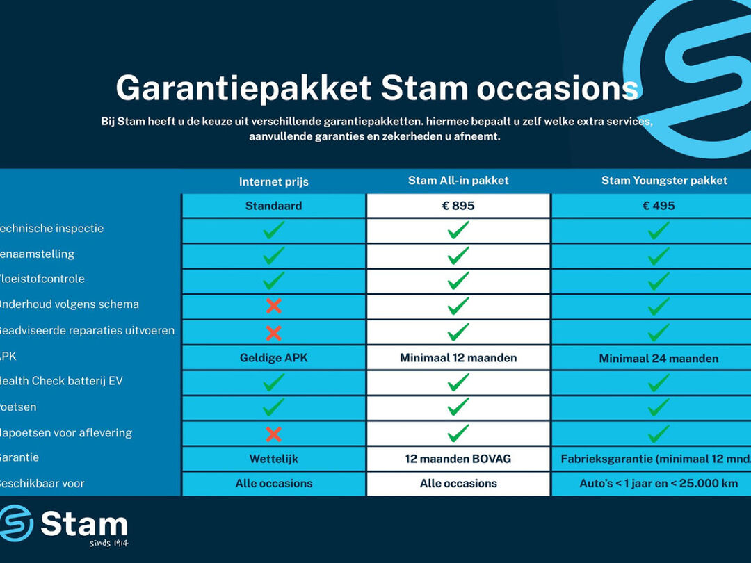 Al onze prijzen zijn inclusief 12 maanden wettelijke garantie en een geldige APK. Voor € 895,- koopt u het Stam All-In pakket met daarin: 12 maanden BOVAG garantie, onderhoud volgens schema, nieuwe APK keuring, technisch klaarmaken en napoetsen. Alle moeite is genomen om de informatie in deze advertentie zo accuraat en actueel mogelijk weer te geven. Fouten zijn echter nooit uit te sluiten. Vertrouw daarom niet alleen op deze informatie, maar controleer bij aankoop de zaken die uw beslissing zouden kunnen beïnvloeden. Stam Autobedrijven sluit iedere aansprakelijkheid voor de in deze advertentie verstrekte informatie uitdrukkelijk uit.