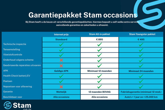 Al onze prijzen zijn inclusief 12 maanden wettelijke garantie en een geldige APK. Voor € 895,- koopt u het Stam All-In pakket met daarin: 12 maanden BOVAG garantie, onderhoud volgens schema, nieuwe APK keuring, technisch klaarmaken en napoetsen. Alle moeite is genomen om de informatie in deze advertentie zo accuraat en actueel mogelijk weer te geven. Fouten zijn echter nooit uit te sluiten. Vertrouw daarom niet alleen op deze informatie, maar controleer bij aankoop de zaken die uw beslissing zouden kunnen beïnvloeden. Stam Autobedrijven sluit iedere aansprakelijkheid voor de in deze advertentie verstrekte informatie uitdrukkelijk uit.