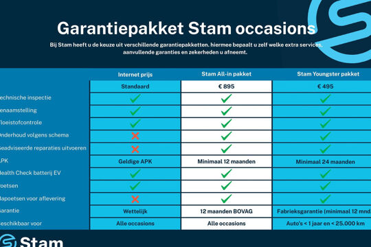 Al onze prijzen zijn inclusief 12 maanden wettelijke garantie en een geldige APK. Voor € 895,- koopt u het Stam All-In pakket met daarin: 12 maanden BOVAG garantie, onderhoud volgens schema, nieuwe APK keuring, technisch klaarmaken en napoetsen. Alle moeite is genomen om de informatie in deze advertentie zo accuraat en actueel mogelijk weer te geven. Fouten zijn echter nooit uit te sluiten. Vertrouw daarom niet alleen op deze informatie, maar controleer bij aankoop de zaken die uw beslissing zouden kunnen beïnvloeden. Stam Autobedrijven sluit iedere aansprakelijkheid voor de in deze advertentie verstrekte informatie uitdrukkelijk uit.